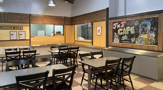ゲレンデを眺めながらお食事を楽しめる開放的なレストラン!ジャングル自慢のオリジナルメニューをゆっくりお楽しみください!