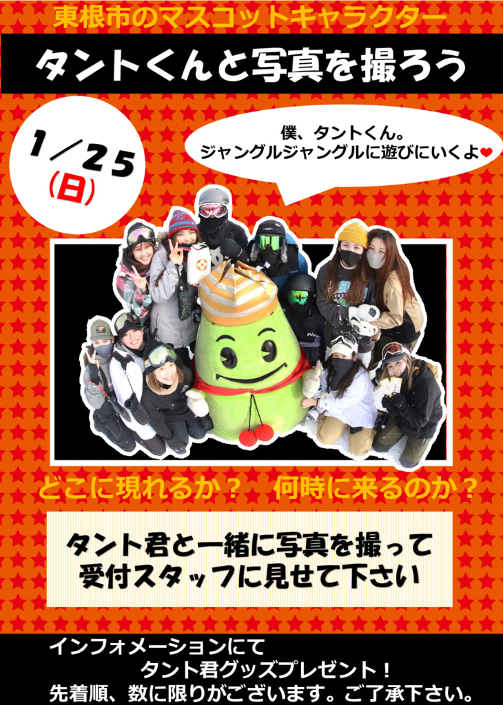 1月25日(日)「タントくんと写真を撮ろう」開催します 東根市のマスコットキャラクター「タントくん」が1月25日(日) またまた、ジャングルジャングルに遊びにやってきます! どこに現れるか?何時に来るのか! タント君といっしょに写真を撮って受付スタッ……