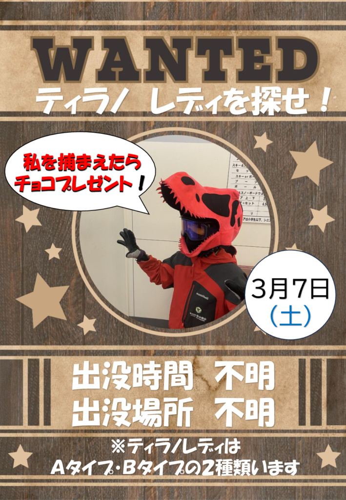 復活イベント!「ティラノさんを探せ」3月7日(土)開催します 昨年、好評頂いたイベントが復活! 「ティラノさんを捕まえろ」 3月7日(土)に開催 何時に現れるか?どこを滑るのか? 捕まえたら「チョコ」1つプレゼントします 数に限りがあり……