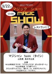 3月22日(日)13:00「Taishiのマジックショー」開催 2026/03/09 13:00 マジシャン「Taishi」タイシ様による マジックショーを開催します 13:00開演。ラスト抽選会前に行います 場所レストラン内 観覧無料。